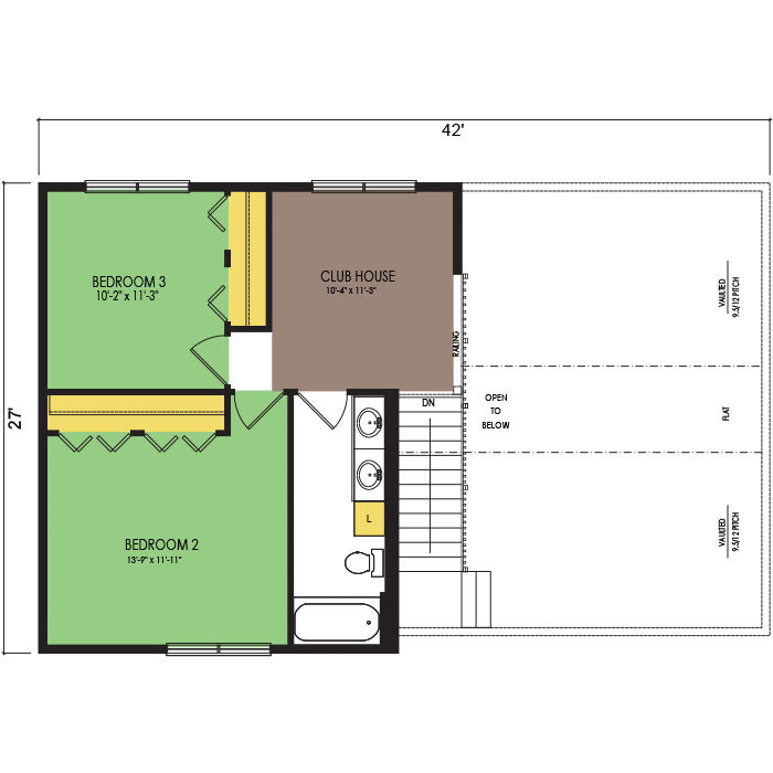 A part of our Vacation Series, the Fairbank floor plan features 3 bedrooms and 2.5 bathrooms with a foot print of 42x28 feet and 1722 total square feet of living space. Floor Plan #VL332