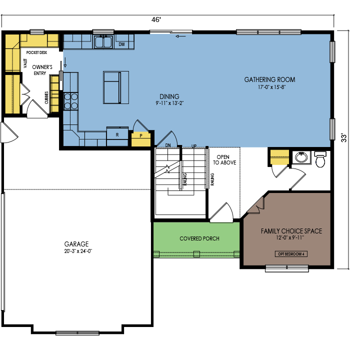 A part of our Family Series, the Yosemite floor plan features 3 bedrooms and 2.5 bathrooms, a 2 car garage, 2 stories, a footprint of 46x42 feet, and 2147 total square feet of living space. Floor Plan #FM233